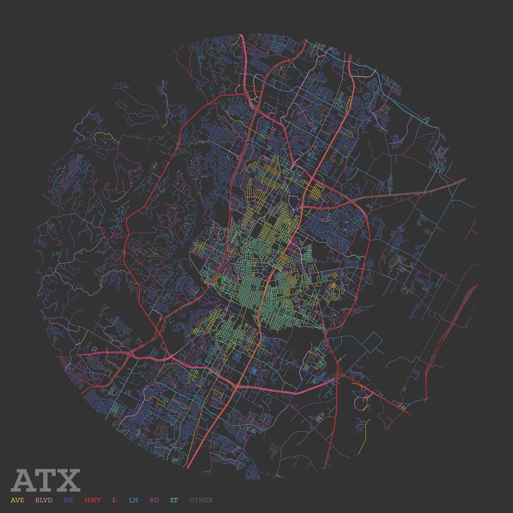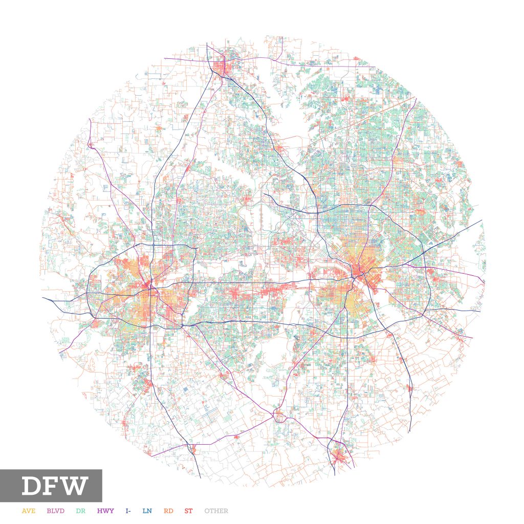 I began by focusing on specific cities with personal relevance, starting with my own current home of Fort Worth, Texas. Despite having lived here for over four years at the time (and working downtown), I hadn’t noticed that downtown Fort Worth is comprised entirely of streets. Not a single avenue. Just streets.