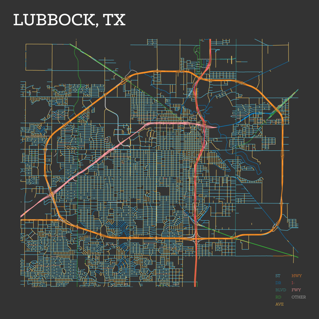 Next, I looked at Lubbock, my home during college. It is a place with a strong grid-based identity. Lubbock’s layout is uncompromisingly orthogonal, thanks in part to the flat, open terrain of the Llano Estacado. There, a consistent system prevails: avenues run north–south, streets run east–west. The underlying geometry is pure Jeffersonian grid: efficient, rational, and legible.